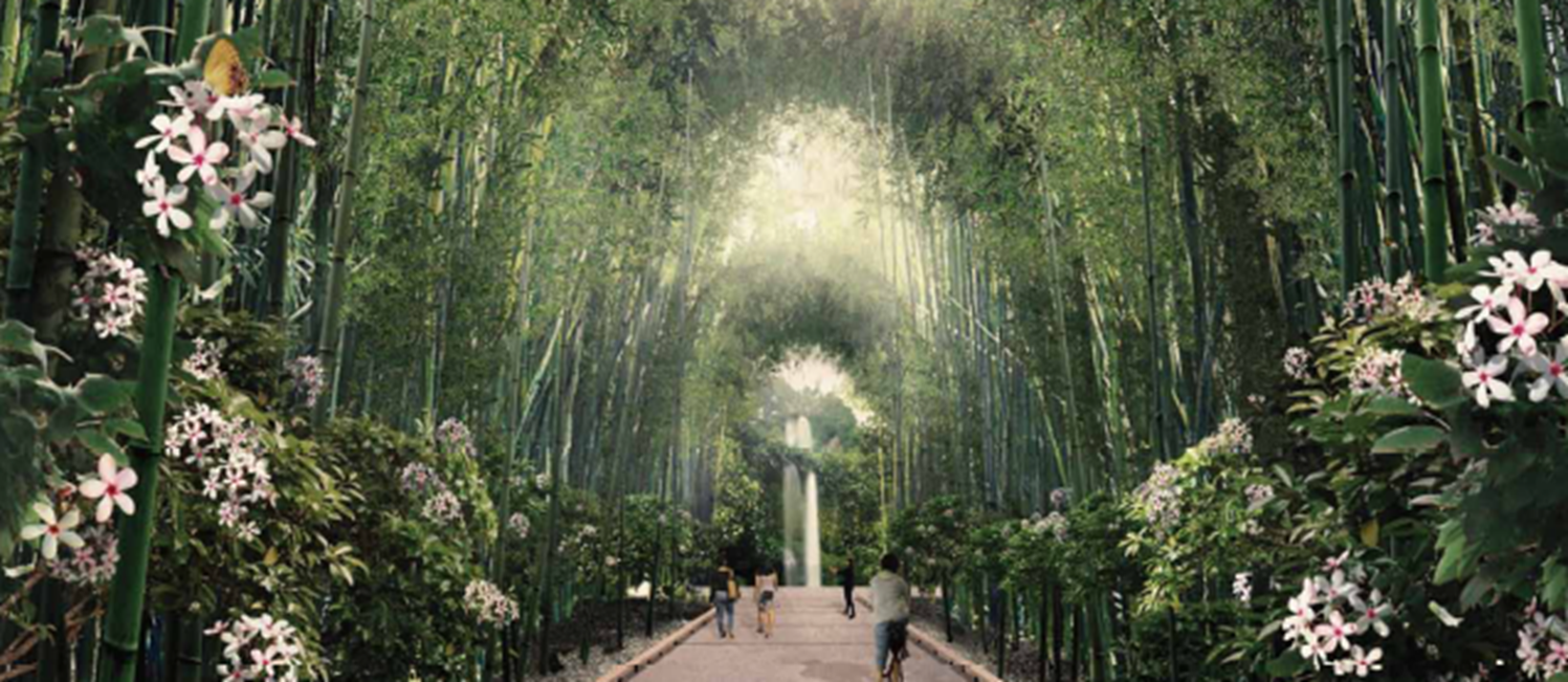 Wind is generated by a waterfall and then channelled through a bamboo tunnel to create a cool corridor.