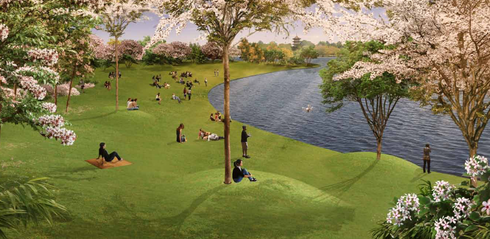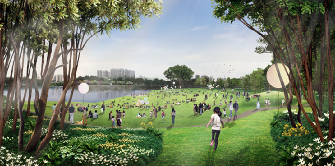 The lawn will provide a panoramic view across Jurong Lake, framed by pink flowering trees along the water’s edge.