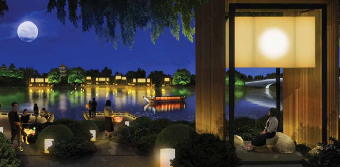 The moon lantern terrace at night, with lantern lights that reflect the different phases of the moon.