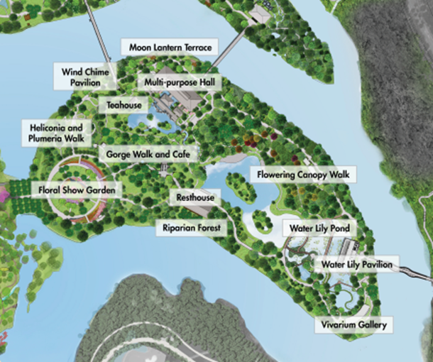 There will be floral and aquatic gardens to showcase the colours of the tropics. A section of the Japanese Garden will be enhanced with a layer of tropical flora. Mature trees, including the Cycads planted by Japanese Emperor Akihito and Empress Michiko in 1970, will form part of the enhanced landscape. New bridges to the north and east of the island provide greater connectivity within thee Gardens as well as to the greater Jurong Lake District.