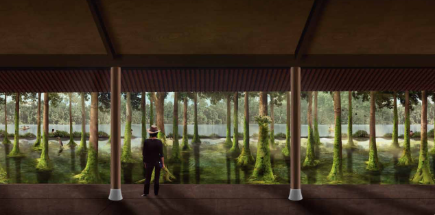 Rest House with a view of the mass and fern garden, which will be periodically inundated with water. Water is cleansed as it is filtered through the landscape.