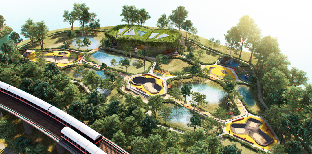 Jurong Lake Gardens contributes to the identity of Jurong Lake District, which is envisioned as a district of gardens and water. The green spaces and waterways will extend from the Gardens into the district. It will eventually comprise 100 hectares of green spaces, 70 hectares of water bodies and 17 km of waterfront areas for social and community activities, as well as spaces for recreation, retail and F&B outlets.