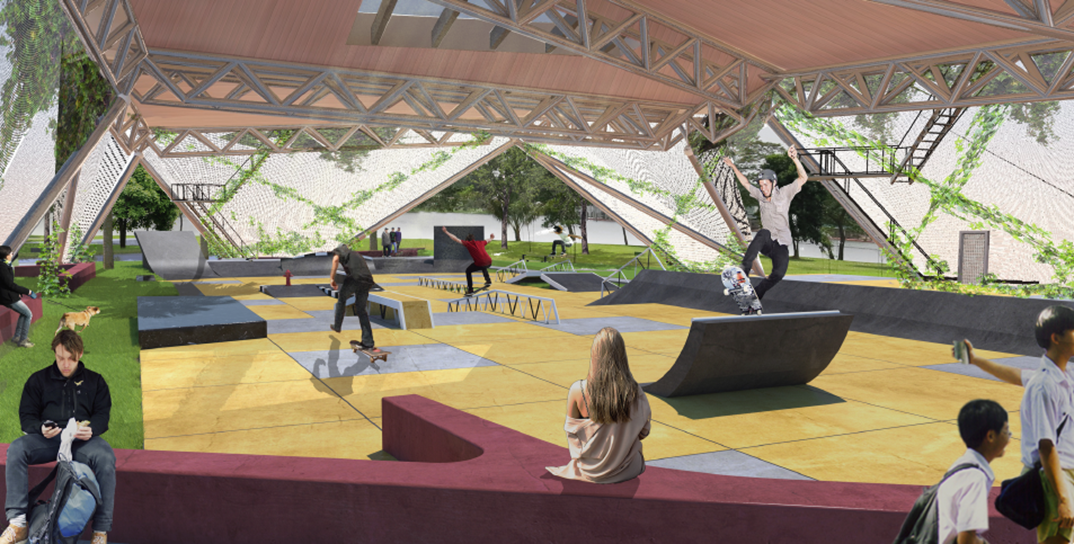 A street plaza area within the youth park features pump tracks and other elements suggested by the community.